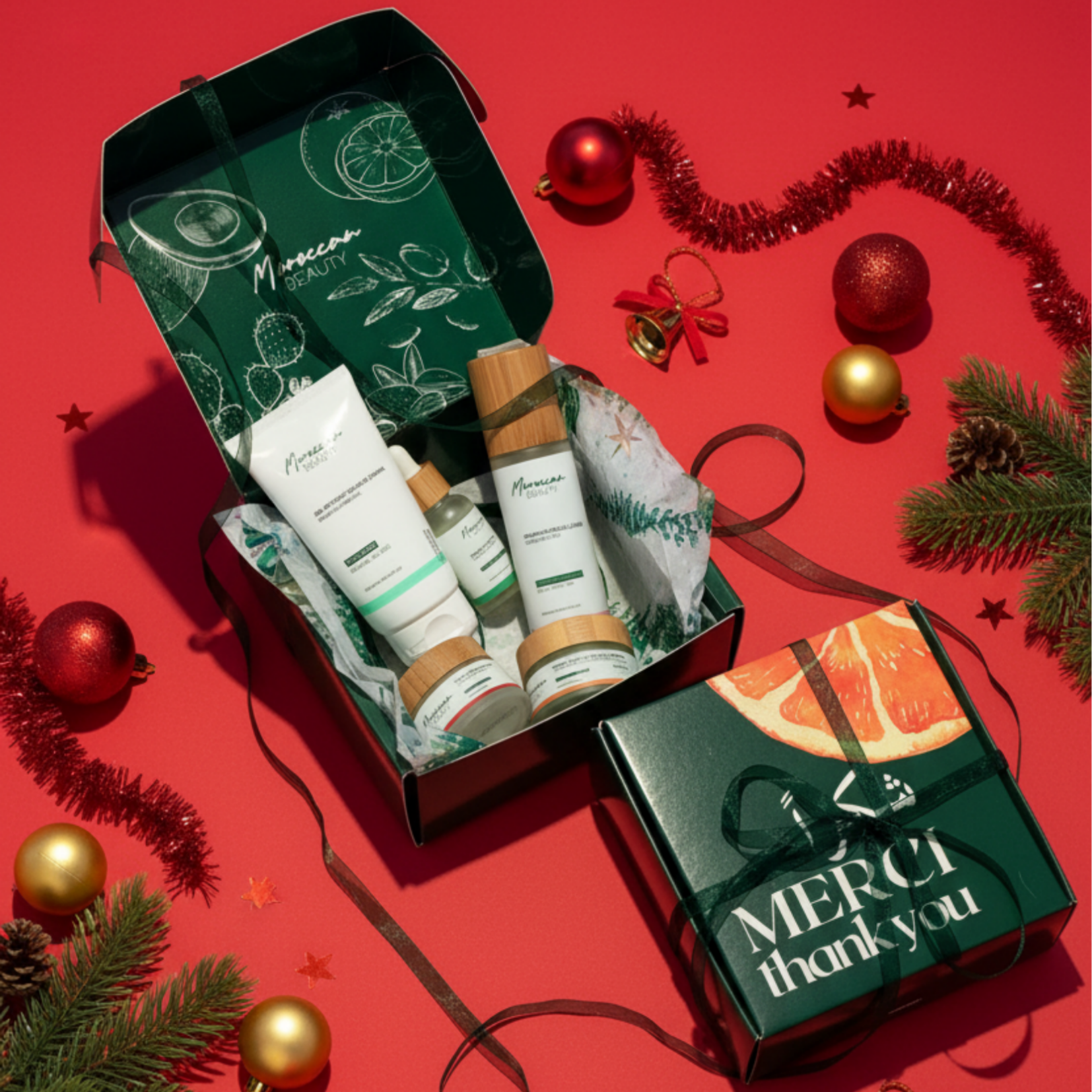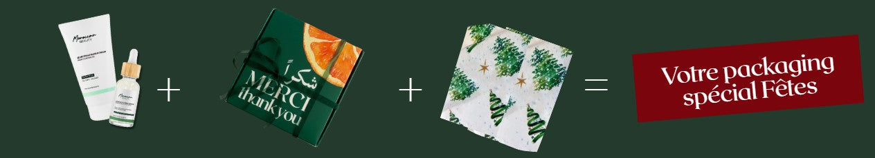 Chaque coffret est soigneusement préparé avec notre papier de soie spécial Fêtes, son ruban vert signature et un sac Moroccan Beauty (selon le coffret)— pour un cadeau aussi beau à offrir que plaisant à recevoir.